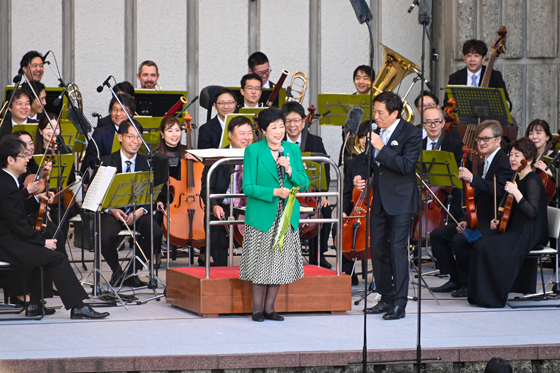 On May 3, Governor Koike enjoyed a concert held at Yaon, an open-air concert hall, in Hibiya Park, together with 2,000 people, and later made their brief adieu to the hall, which is to undergo a renovation as part of the redevelopment of the park.