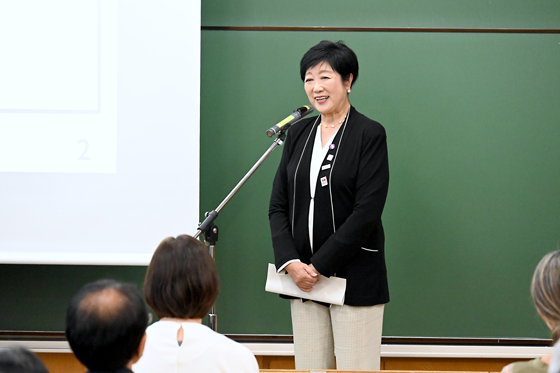 During her visit on July 8 to Tokyo Metropolitan University’s Premium College, a program designed for lifelong learners aged 50 and older, Governor Koike observed a class and spoke with the senior students.