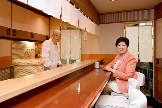 On September 18, Governor Koike visited Mr. Ono Jiro (born October 27, 1925), ahead of his 100th birthday, at his renowned sushi restaurant.