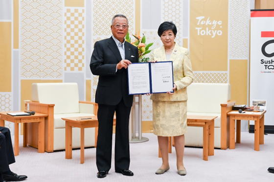 On October 16, Governor Koike attended a signing ceremony for an agreement with Iwatani Corporation, together with the company’s Chairman and CEO Makino Akiji.