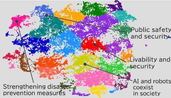 Tokyo developed the Tokyo 2050 Strategy, a new comprehensive strategy for the city, through an AI-powered listening approach known as Broad Listening. Broad Listening is a method that utilizes AI technology to efficiently gather, analyze, and visualize a large volume of public opinions. In developing the Tokyo 2050 Strategy, 27,000 individual opinions were analyzed and visualized using AI, integrating diverse perspectives into the planning process. In the diagram below, each dot represents a single opinion, and similar opinions are grouped together through AI analysis. This visual representation enabled a deeper understanding of the wide range of views, helping shape the Tokyo 2050 Strategy more inclusively and effectively.