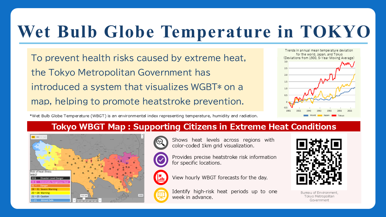 Another highlight was the “Tokyo WBGT Map,” which was released in June 2025. Extreme heat poses a serious threat to vulnerable groups, including the elderly and children. It is essential to encourage preventive actions against heatstroke by providing timely and accurate information. This map provides information useful for preventing heatstroke by visualizing the Wet Bulb-Globe Temperature (WBGT). Residents can assess real-time information about heatstroke risks in familiar places such as their homes, workplace, and schools, and enabling them to make appropriate decisions regarding their activities.