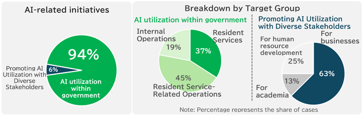 As cities worldwide explore the potential of AI, Tokyo is also leveraging this technology to enhance public services and streamline government operations. Tokyo is already making active use of AI across a wide range of areas, helping us improve both public services and internal operations. Currently, 94% of our AI initiatives focus on government use, while 6% promote AI utilization among diverse stakeholders. Within government use, 37% target resident services, 45% support resident service-related operations, and 19% enhance internal operations.